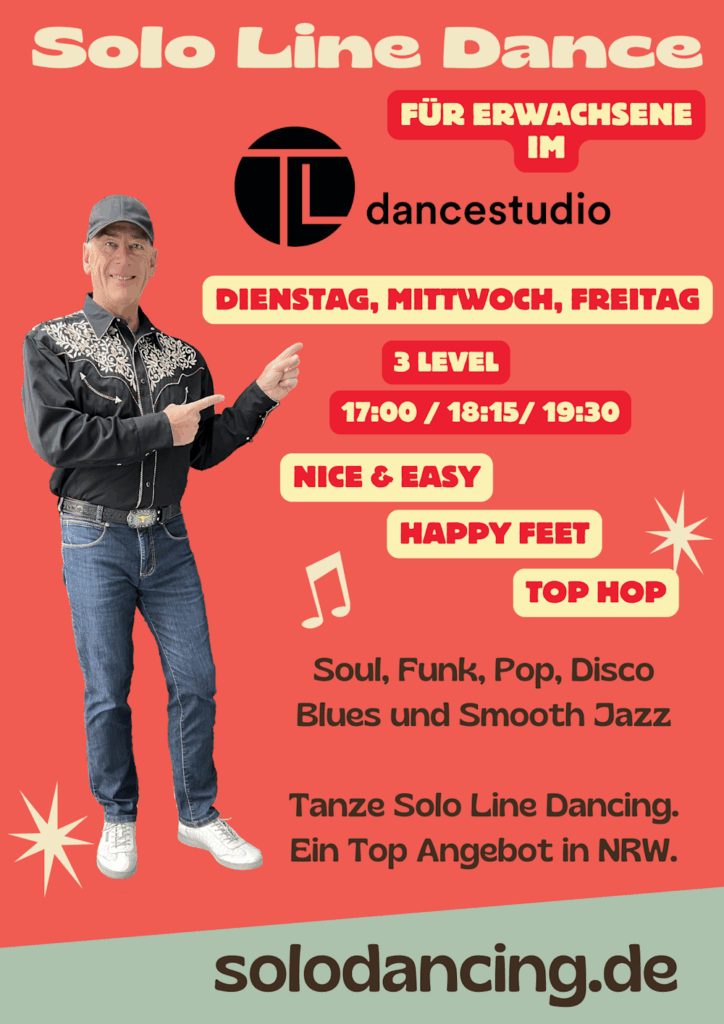 Grundsätzlich möchte ich Euch Angebote im moderatem bis sportiven Solo & Line Dance anbieten. Die Zielgruppe ist weit gefasst: Von 18 Jahre bis „Fit genug“. Die meisten die bei uns Tanzen, sind vom Alter her sicher eher 30+.